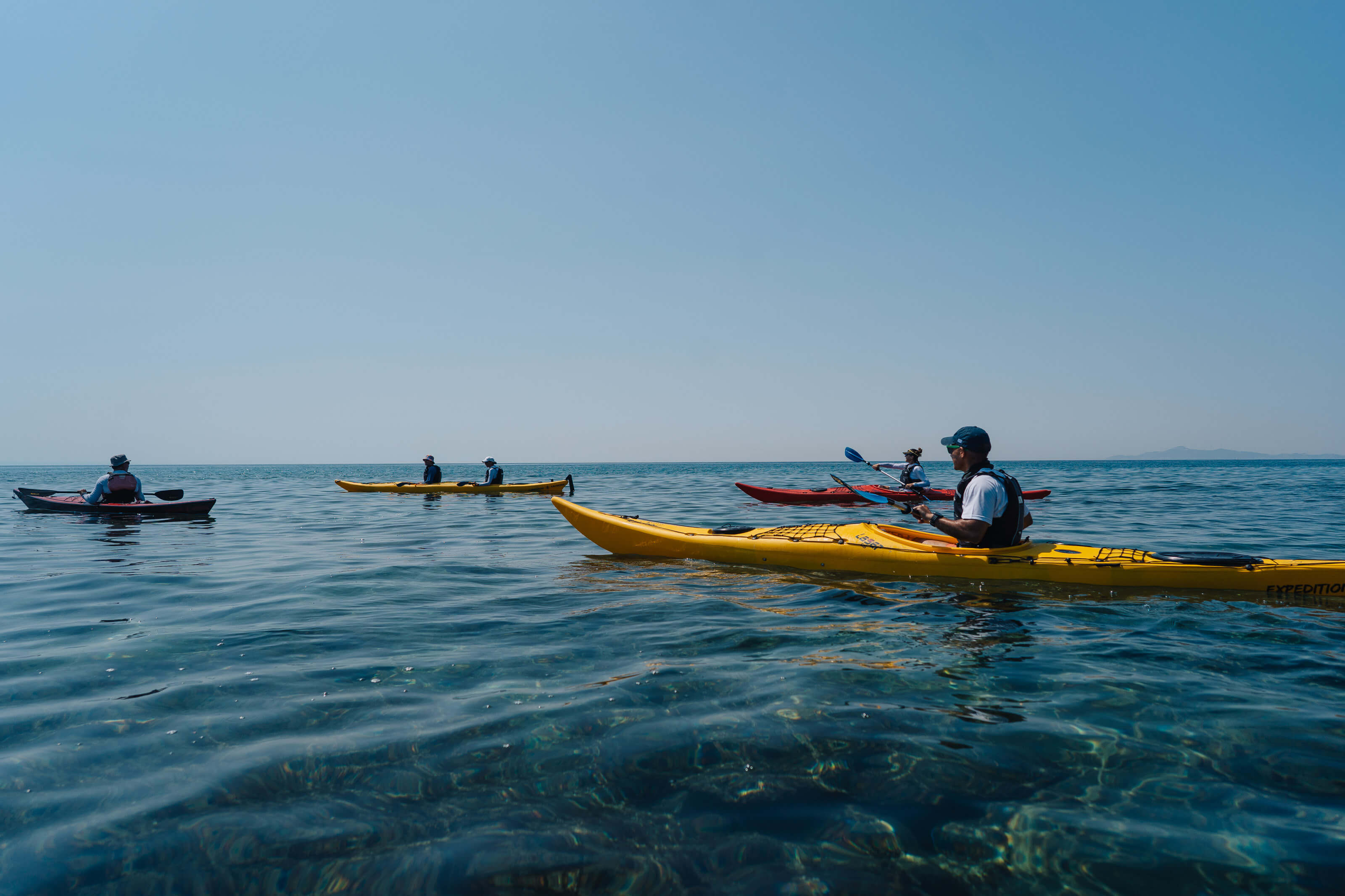 Colourful kayaks await us lined up on the sandy beach of Legrena, our carriages for the day. Our group gets to choose between single and double kayaks, depending on the mood, experience and adrenaline levels of each member. Our morning chit-chat quickly leads to exchanging stories about similar adventures, right before our two guides call for the short training session to begin. It’s almost 10 am on a hot July day in Athens and perfect weather conditions grant us a gorgeous calm sea. With everyone in a great mood and sharing the excitement we're off to a great start, zero paddles in.