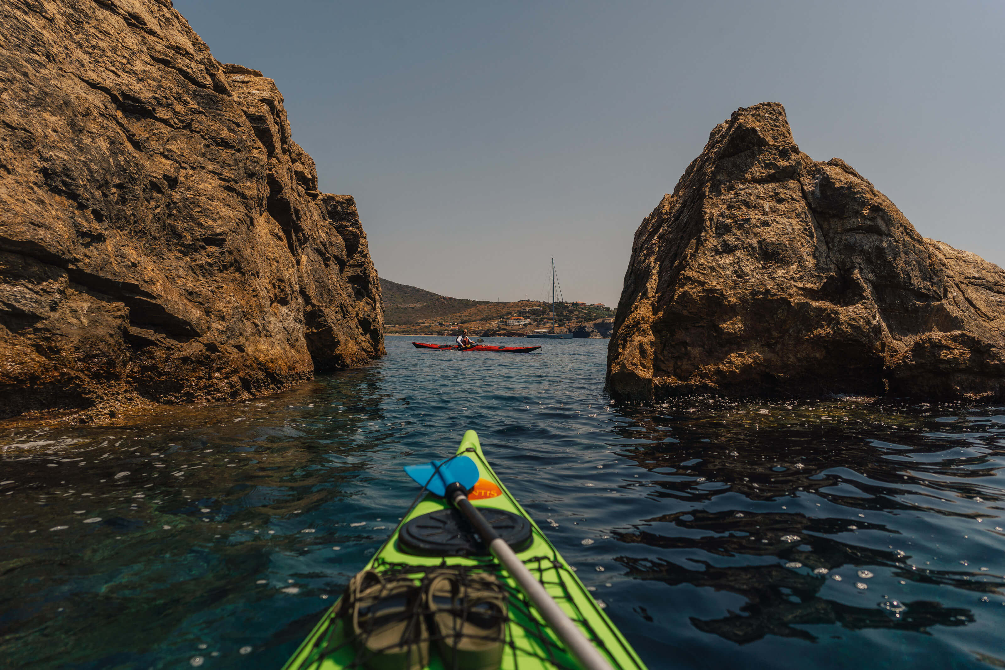 Following half an hour, give or take, of smooth kayaking, it is time for a short adventure. After being given a tour of the area’s hidden bays and caves we are now headed for our first challenge; a narrow sea passage between two large rocks. Our Argonauts vs the Symplegades moment is crowned a great success, as one by one we paddle our way through, sharing the adrenaline rush and complimenting each other on our splendid technique.