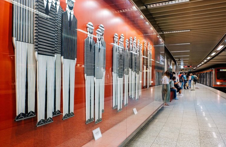 The Line 1 portion of Omonia station is one of the best examples of late nineteenth-century grandeur on the metro system, with its elegantly-tiled walls and beautiful signage and lettering. The modern interchange concourse features two murals that convey the hustle and bustle of their setting. ‘Queue’ by Nikos Kessanlis—a former dean of the Athens School of Fine Arts, activist and all-round radical voice - shows ghostly silhouettes waiting in a queue, who seem to blend in with the commuters rushing past. ‘Football Players’ by Pavlos Dionisopoulos is created with paper and scissors—one of the diverse mediums he works in, from conventional paint and canvas to cheap everyday items.