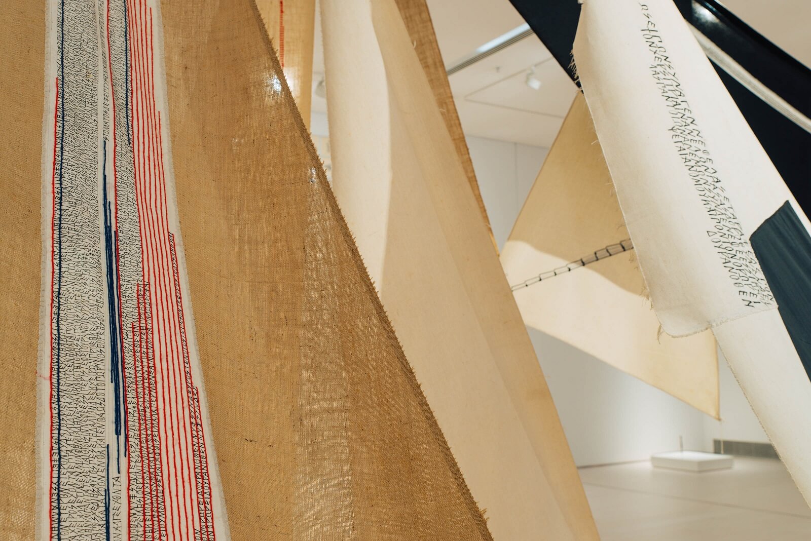 Die Geschichte dahinter: Diese faszinierende und komplexe athenische Künstlerin nahm ein Blatt aus dem Leonardo da Vinci-Spielbuch, indem sie ihre künstlerischen Riffs zur griechischen Mythologie mit der Sprache der Mathematik verschmolz. Seit den 1970er Jahren beschäftigte sich Davou insbesondere mit der Fibonacci-Folge und der Kybernetik (sogar mit dem Erlernen des Codierens im Mittelalter). Diese auffällige Installation von segelartigen dreieckigen Textilien ist sowohl mit homerischen Versen als auch mit Fibonaccis goldener Spiralsequenz bestickt und schafft einen mehrstufigen poetischen Diskurs.