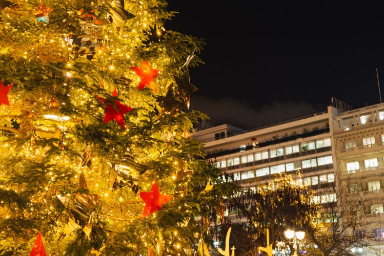 die Atmosphäre genieße: Das dekorierte Stadtzentrum von Athen, insbesondere das klassische Weihnachtsgefühl der Voukourestiou-Straße in Kolonaki.
